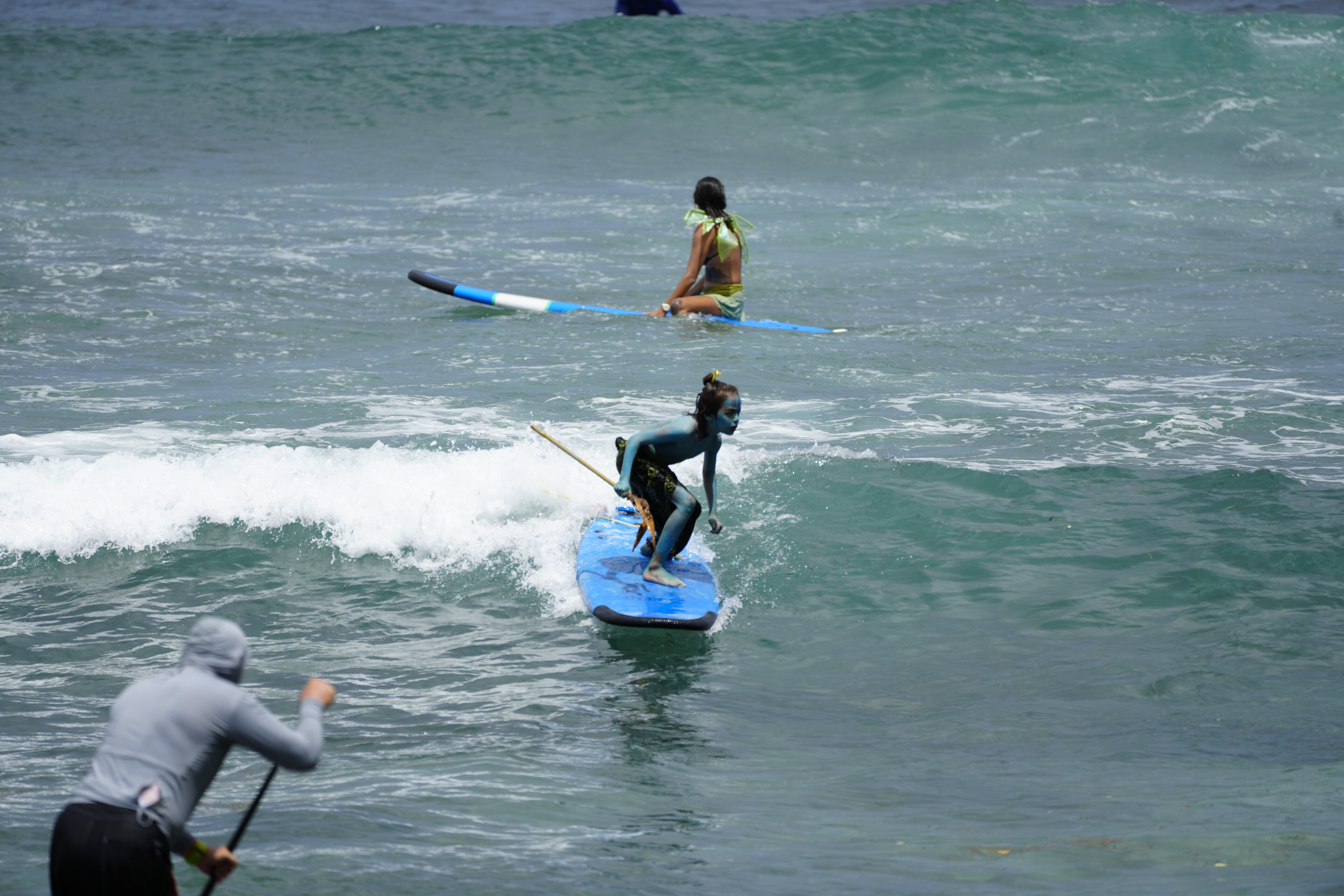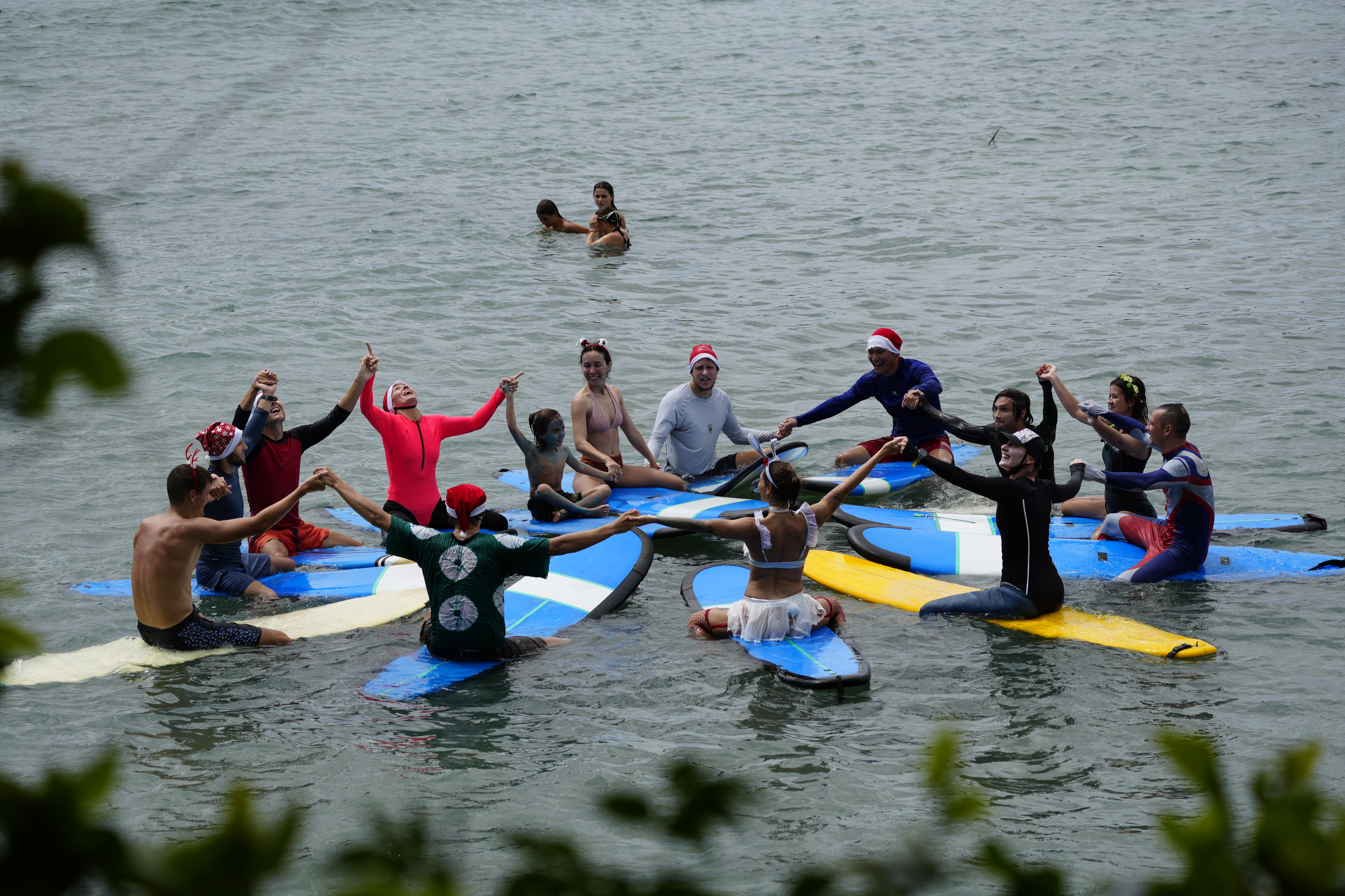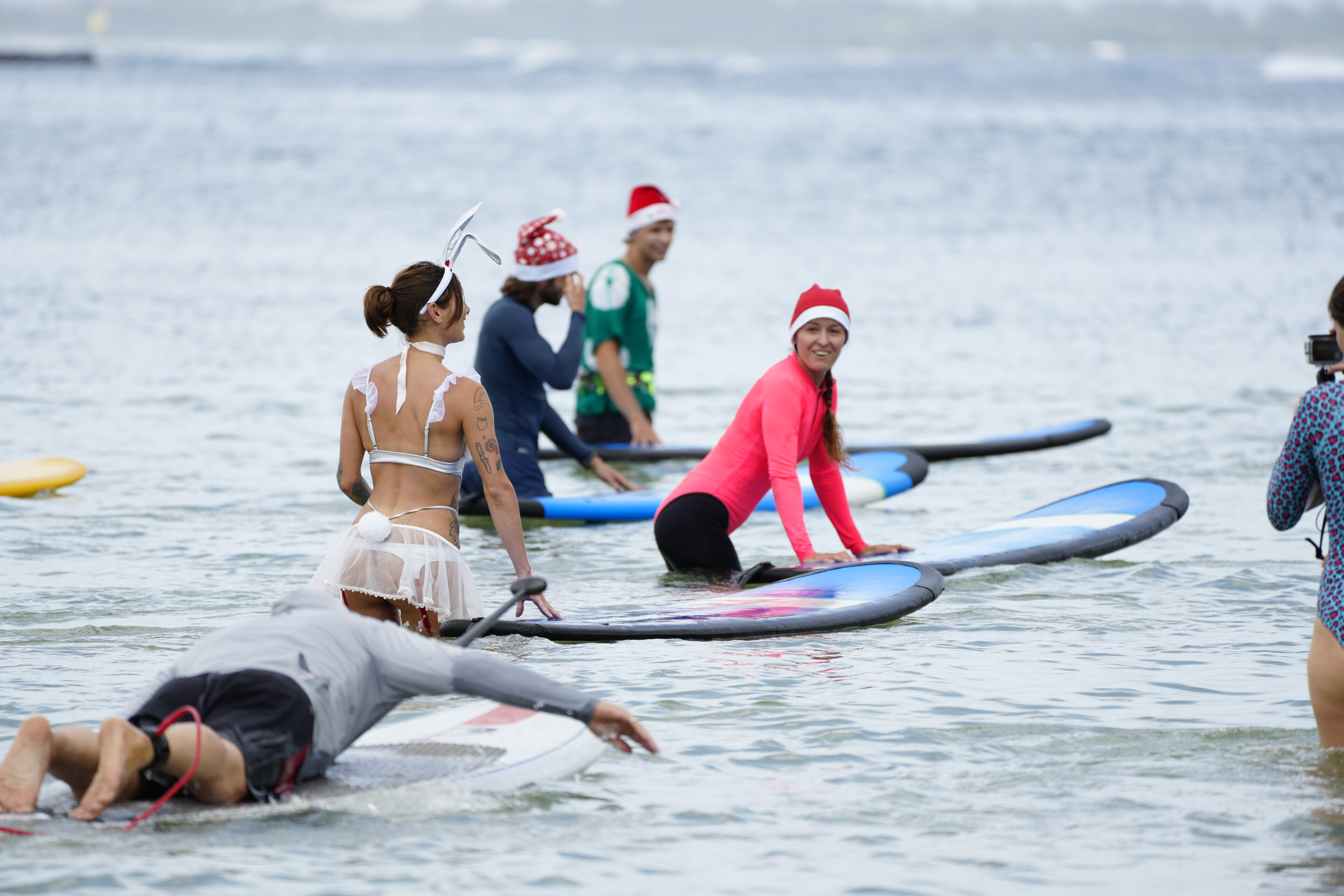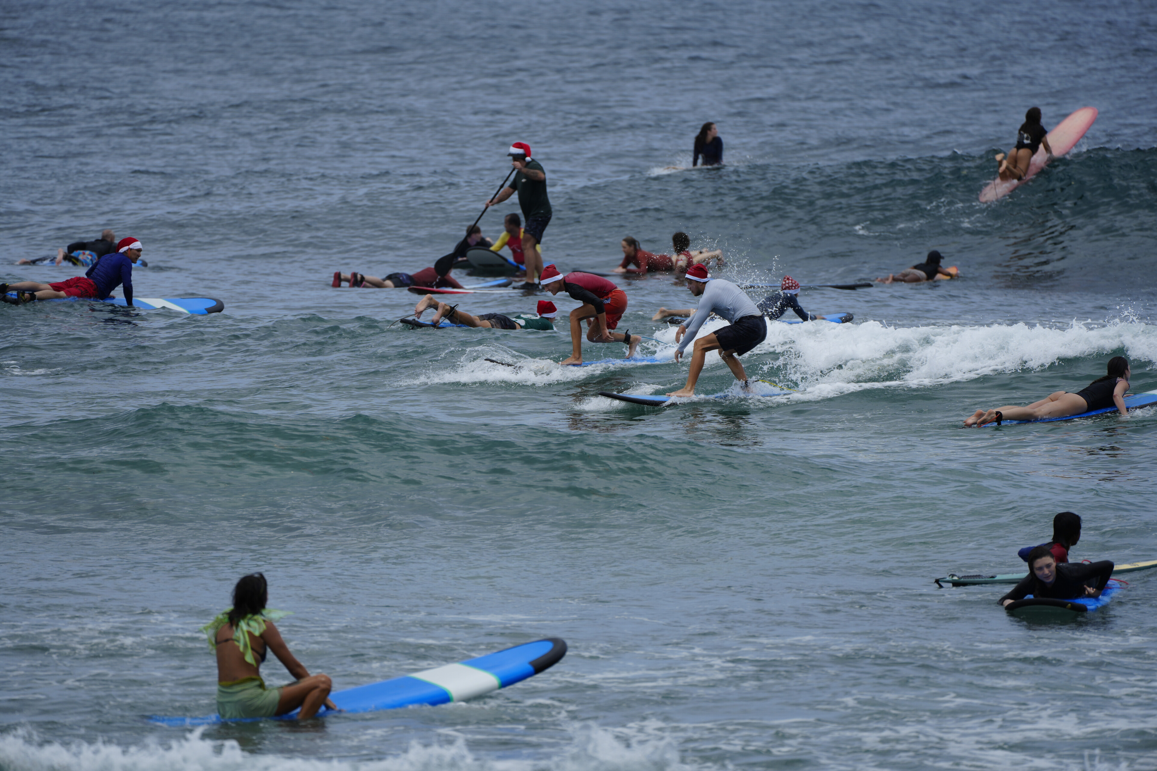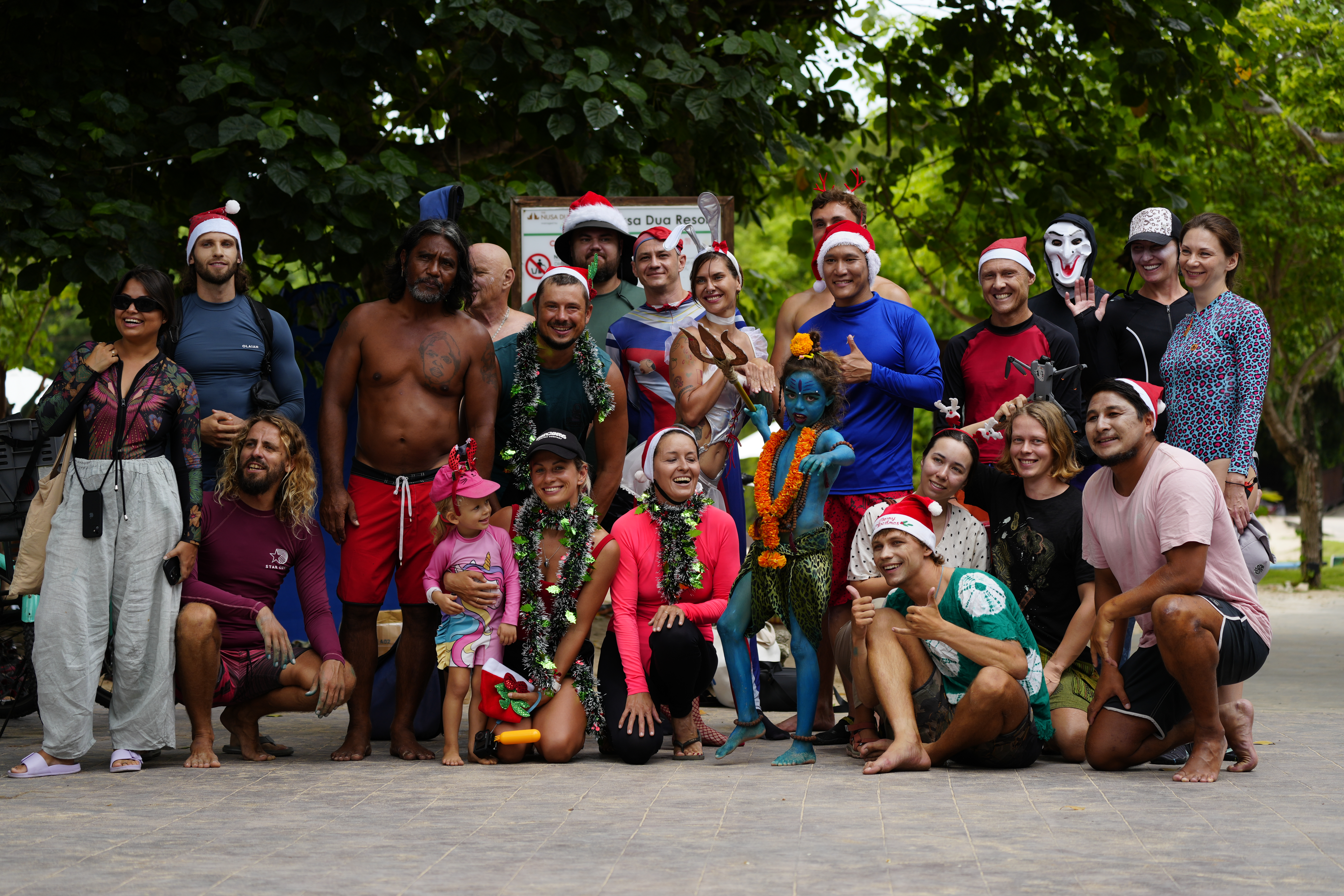 25 человек вышли в океан в новогодних и фрик-костюмах. Среди образов были традиционные Деды Морозы и Снегурочки, феи, новогодний супергерой, кролик и даже сам бог Шива, который серфил вместе со всеми.