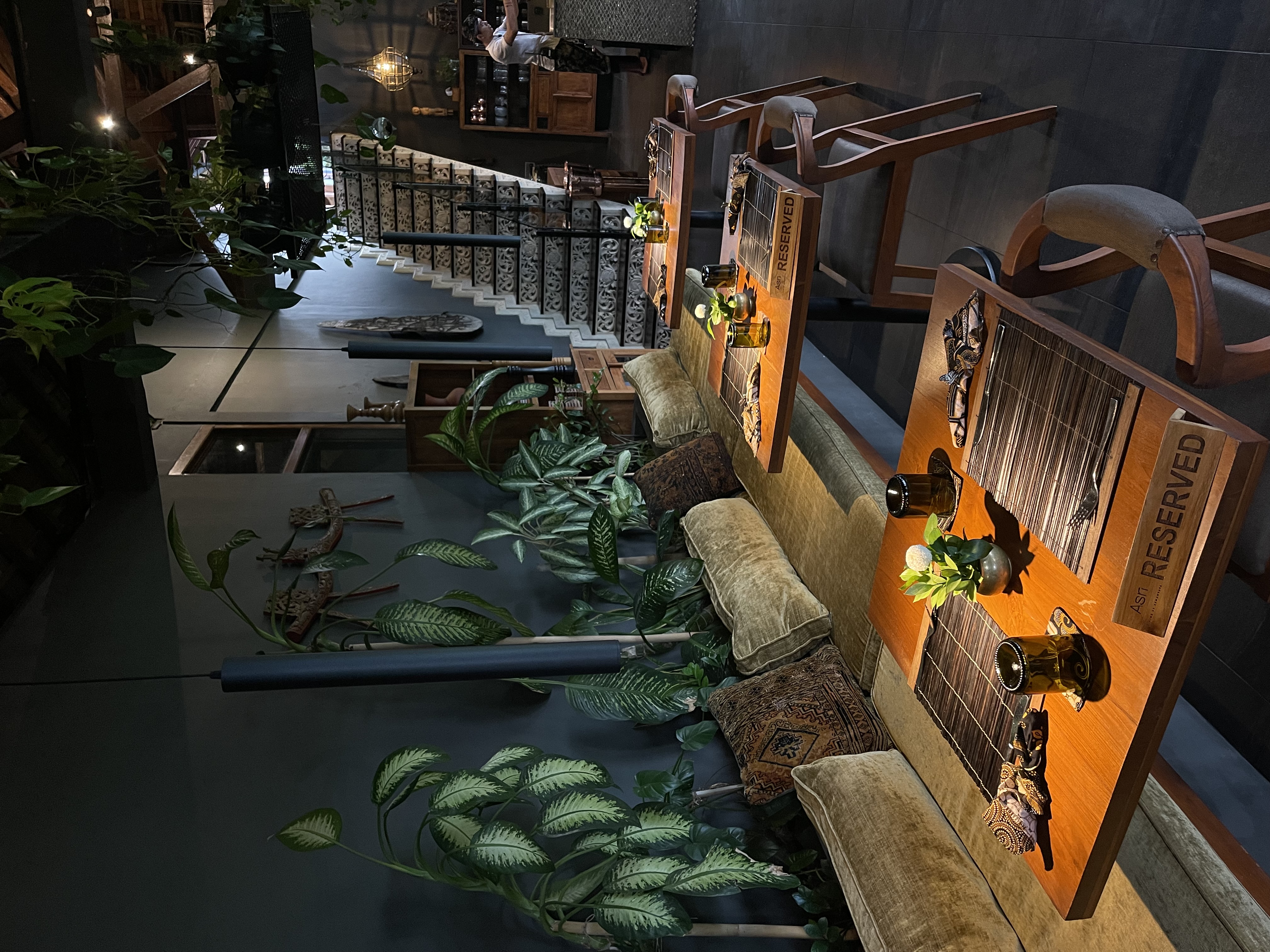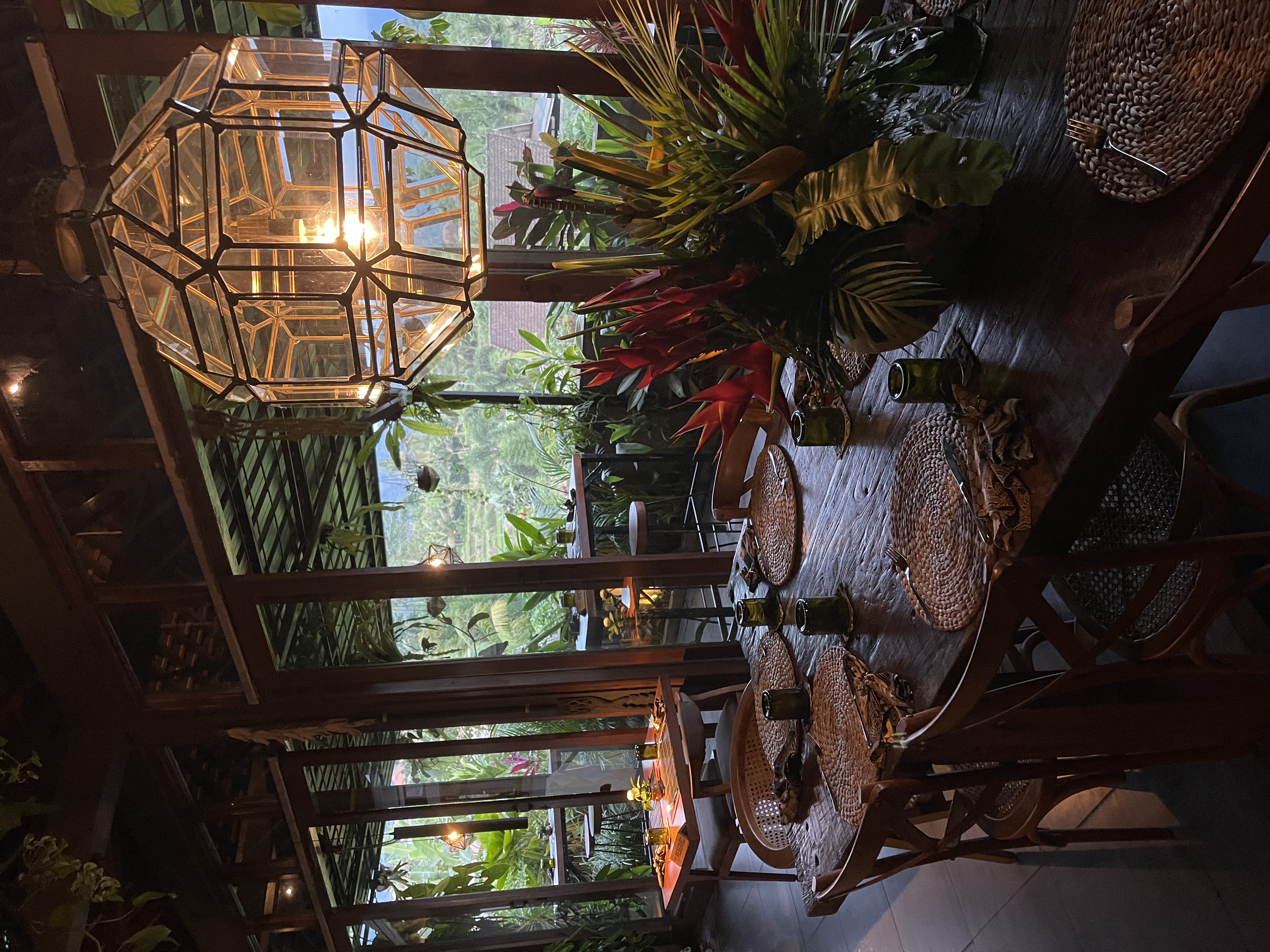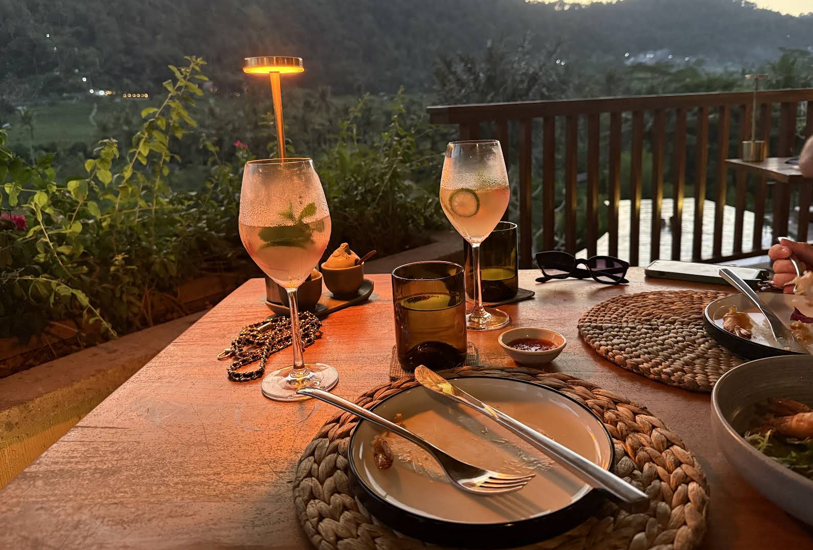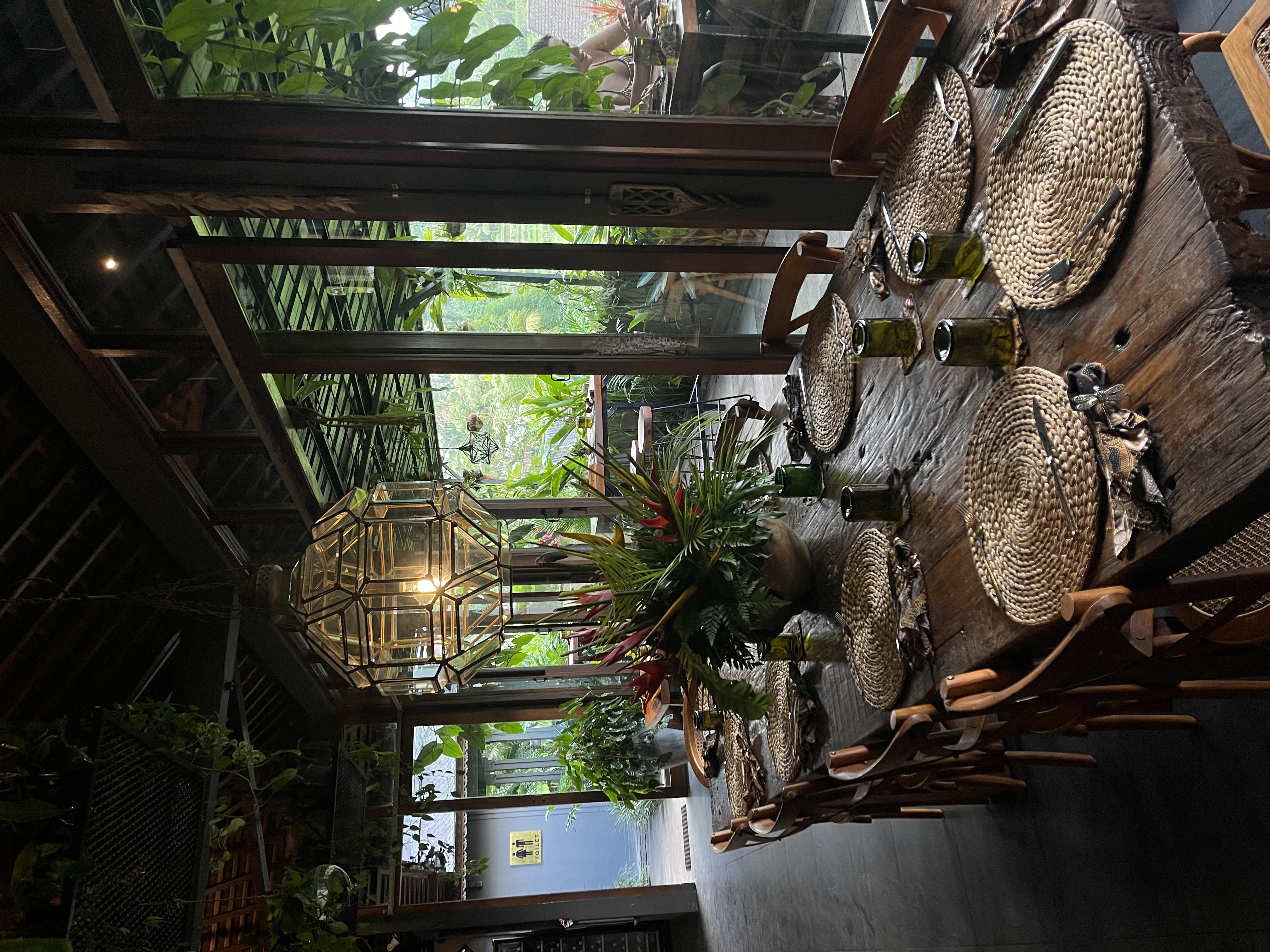 Ресторан с европейской фьюжн кухней с видом на рисовые поля при отеле Samanvaya. Более высокий ценовой сегмент, стильный интерьер, хороший выбор вин и качественное исполнение блюд.