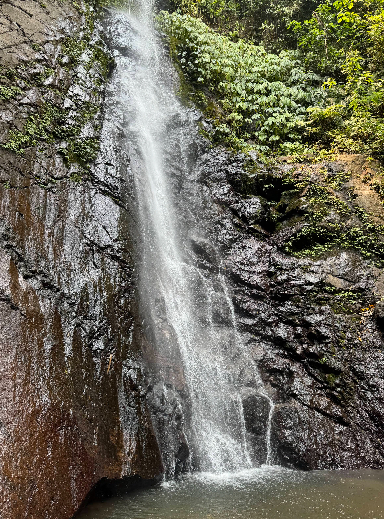 Высокий и мощный водопад, окружённый густыми тропическими джунглями. Место очень тихое, практически нет туристов.