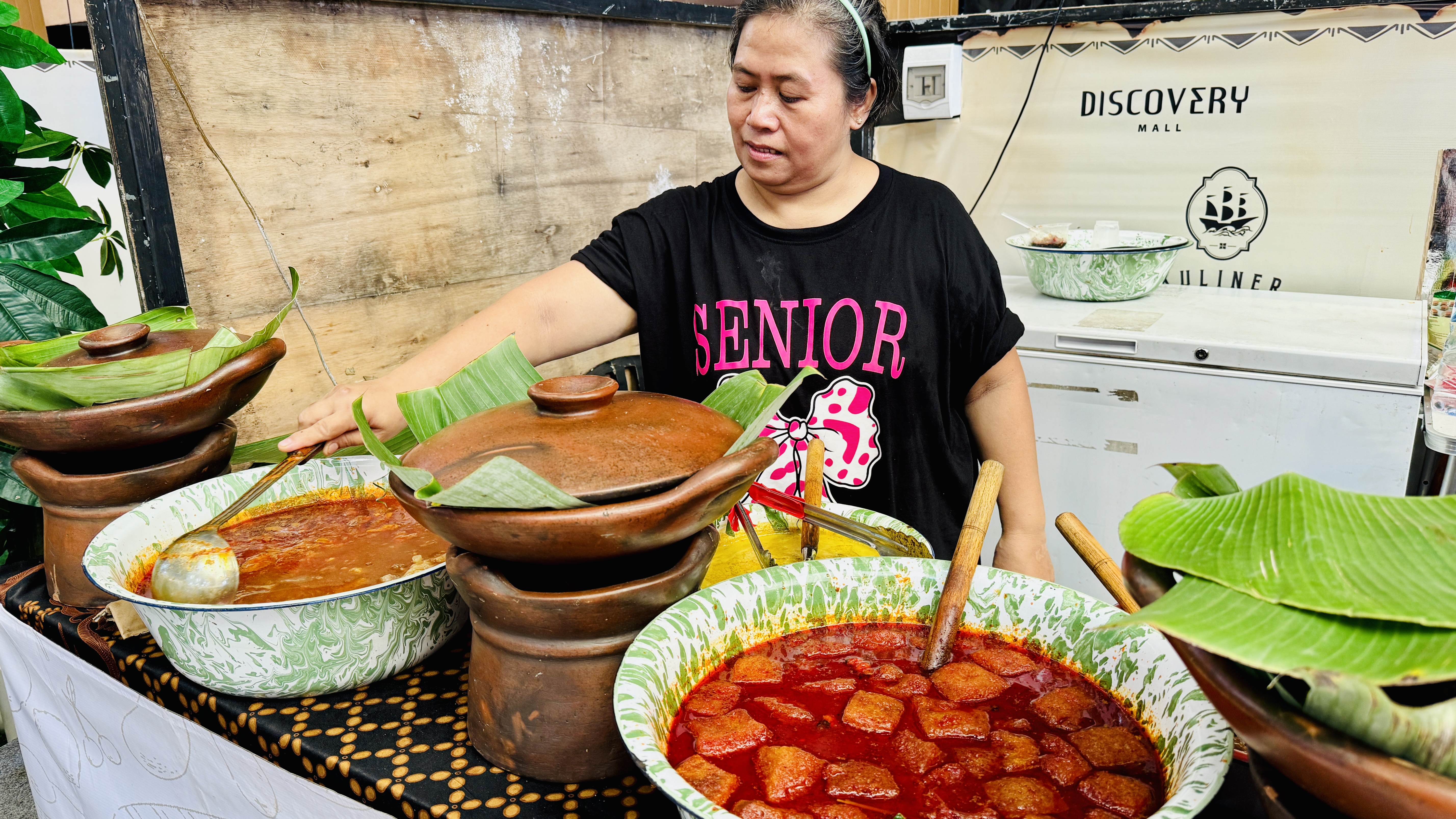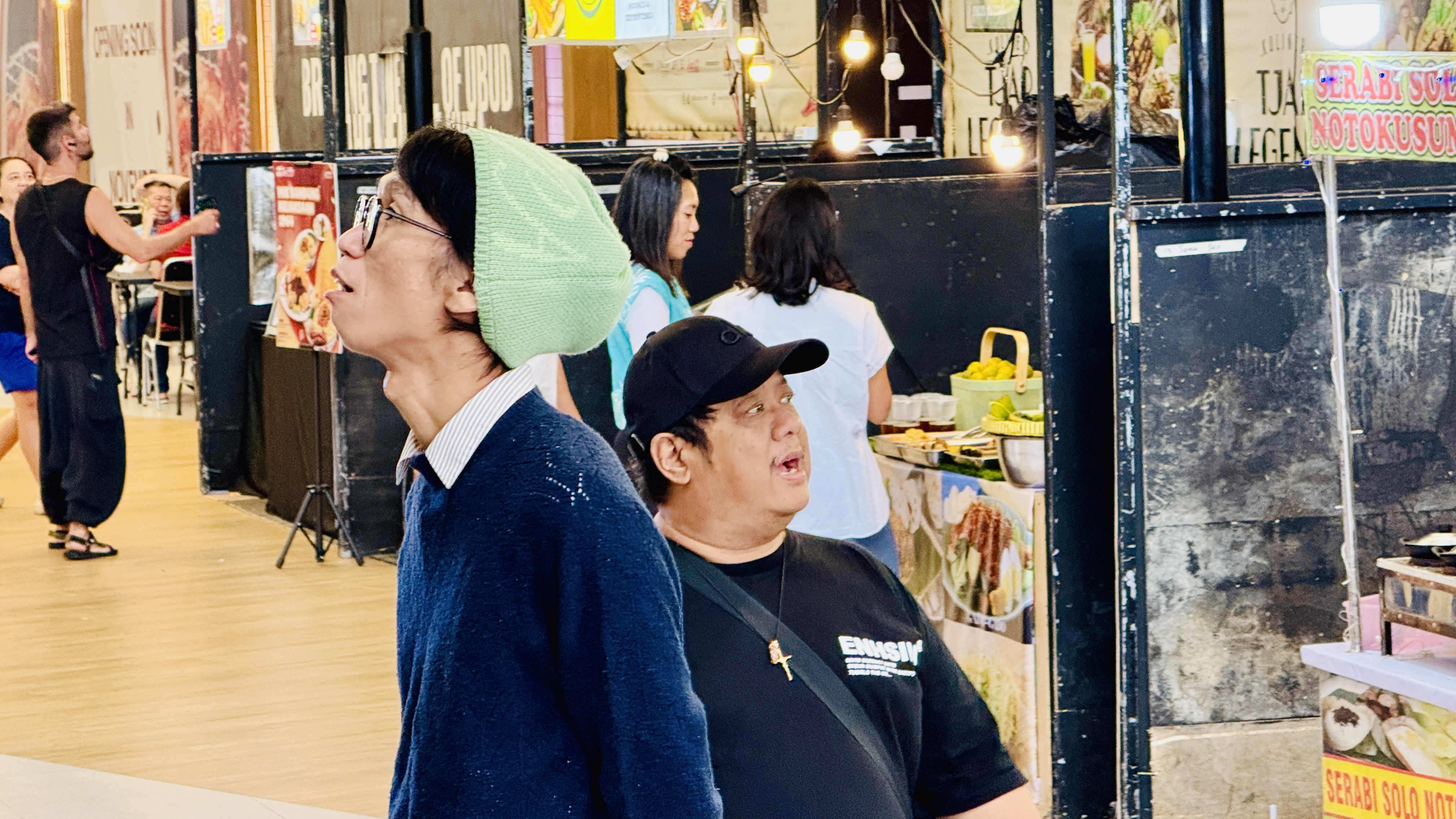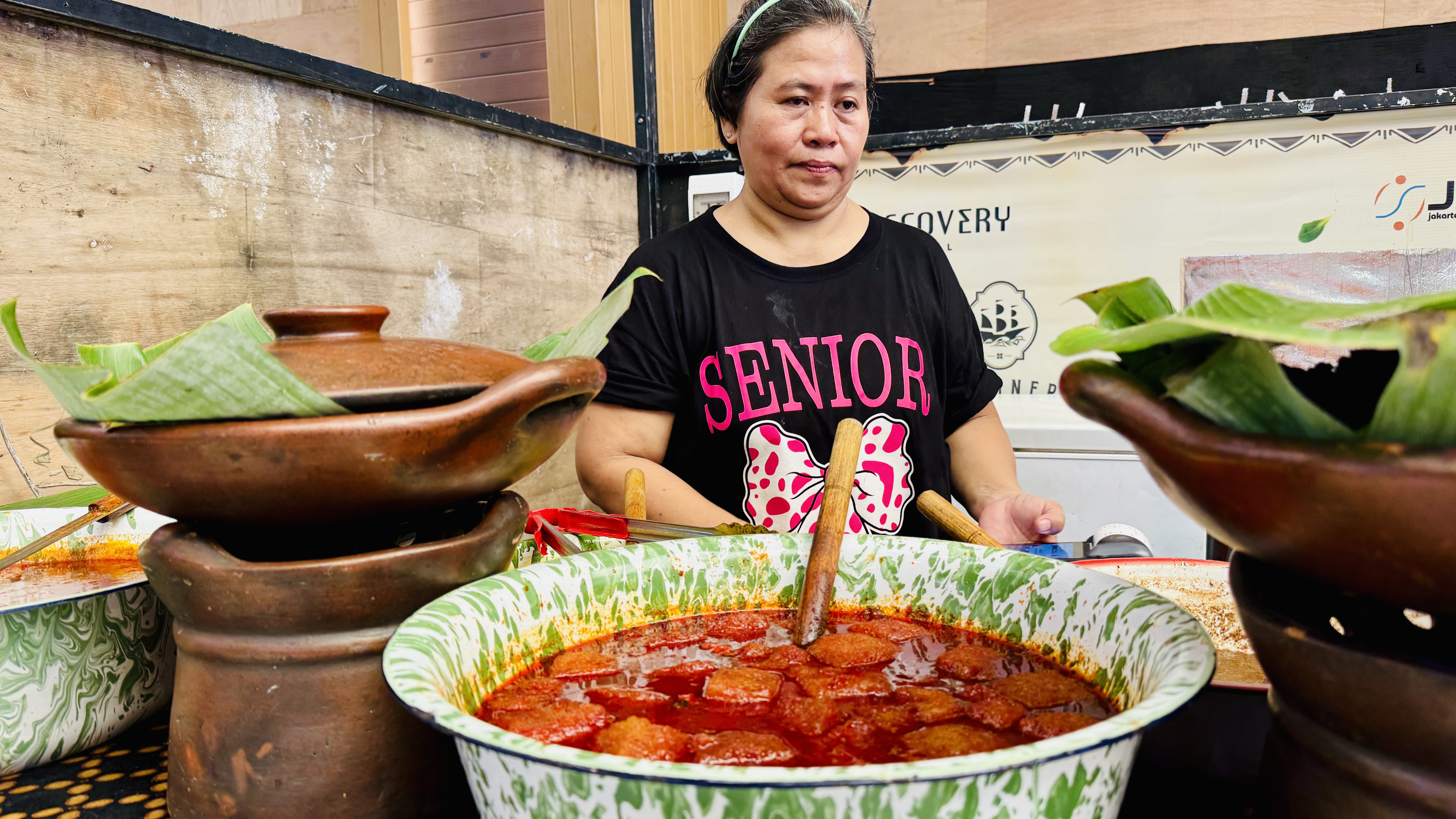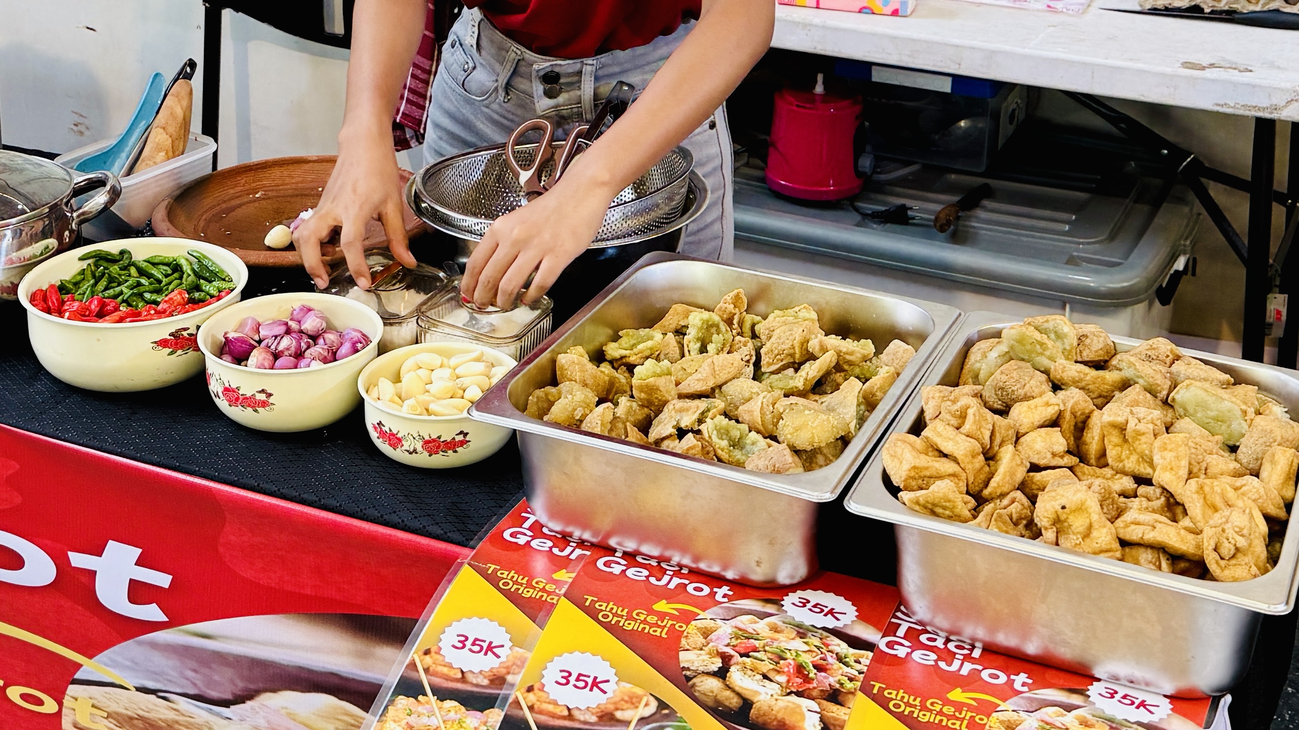 На соседнем стенде у женщины с Калимантана что-то очень острое. Такой цвет еды не может обманывать. Оставим на следующий раз, сегодня вкусовые рецепторы нам еще пригодятся.