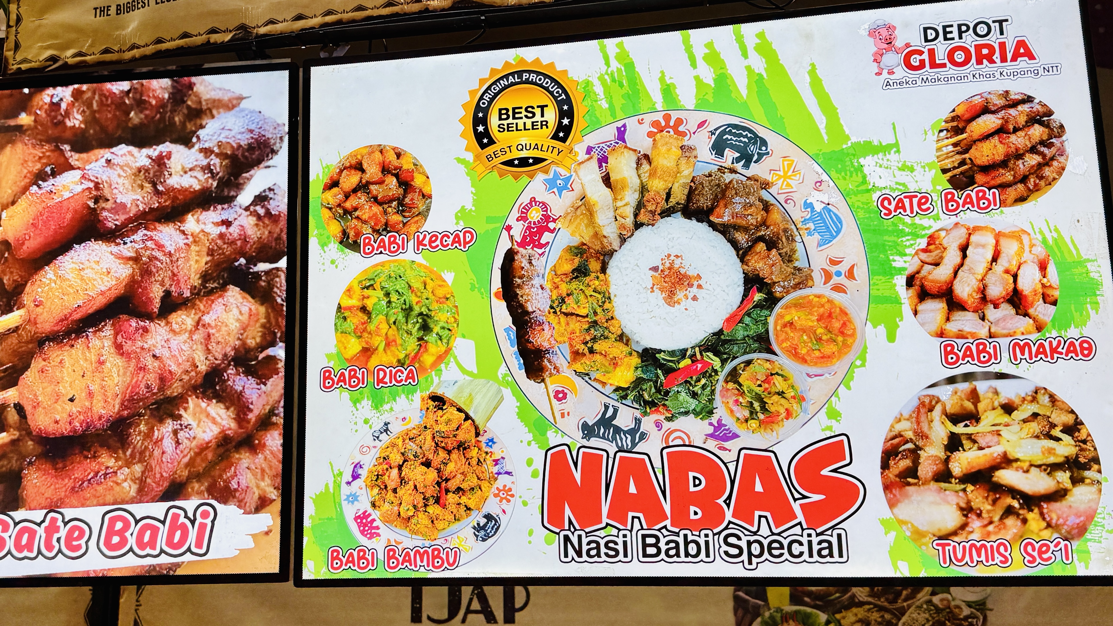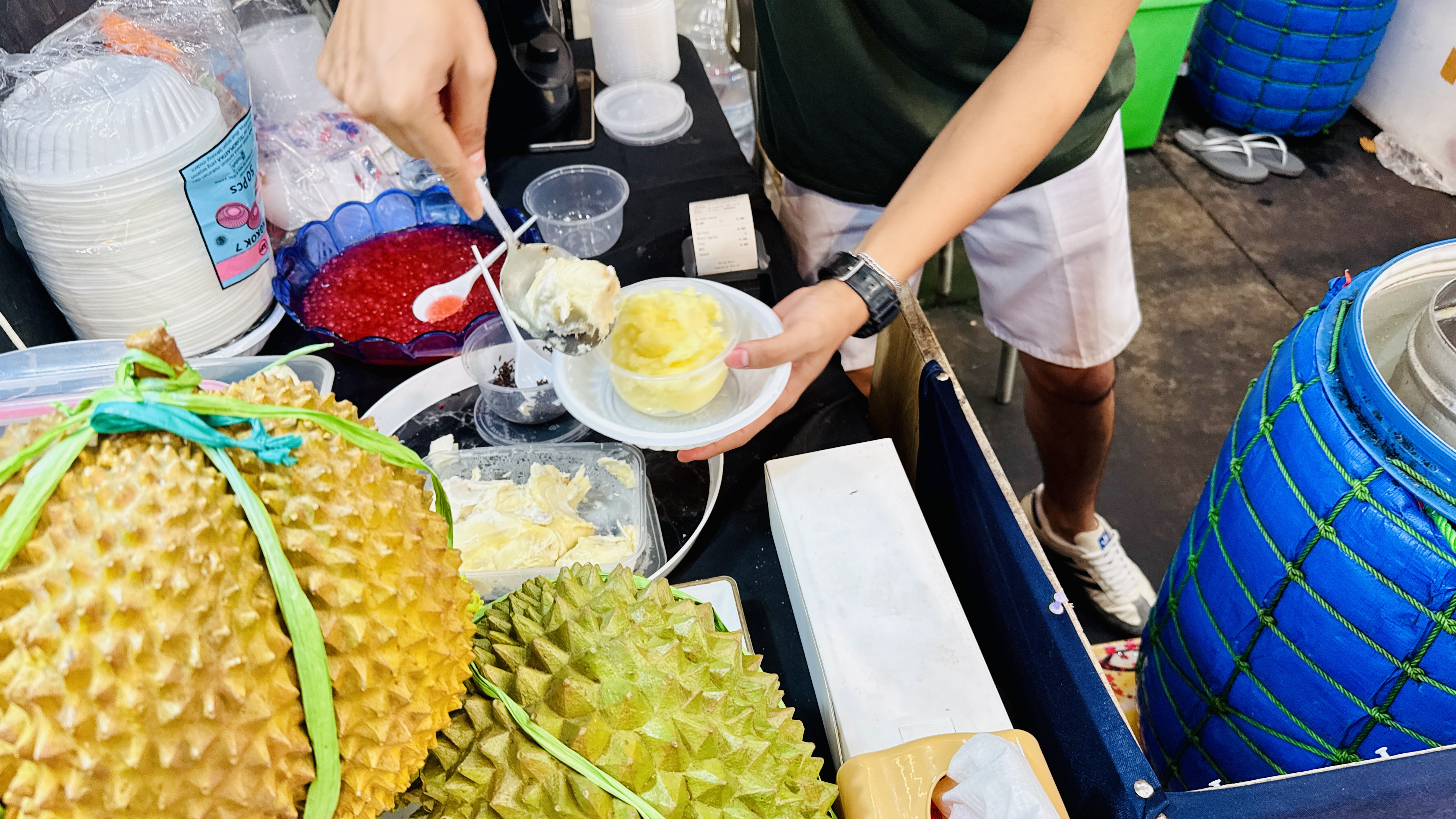 По пути к корнеру с дурианами, который мы увидели издалека, попадается стенд со свининой. Тут привычные балийцам сате и еще пара тройка блюд. Самое удивительное, что привезли их из Купанга, это на Восточном Тиморе…а как же Индонезия - мусульманская страна? Загадка…