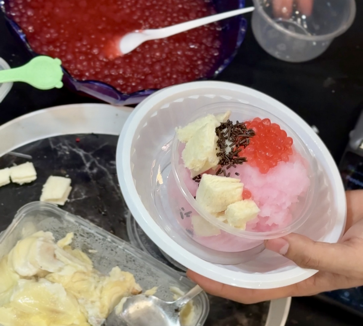 Ну последнее на что в нас осталось место — это мороженное с Сулавеси. В целом ничего фантастического. Фруктовый лед трех видов — авокадо, кокос, дуриан. К каждой порции продавец накладывает шоколадную крошку, шарики желе так похожие на красную икру и нарезанный хлеб — классика.