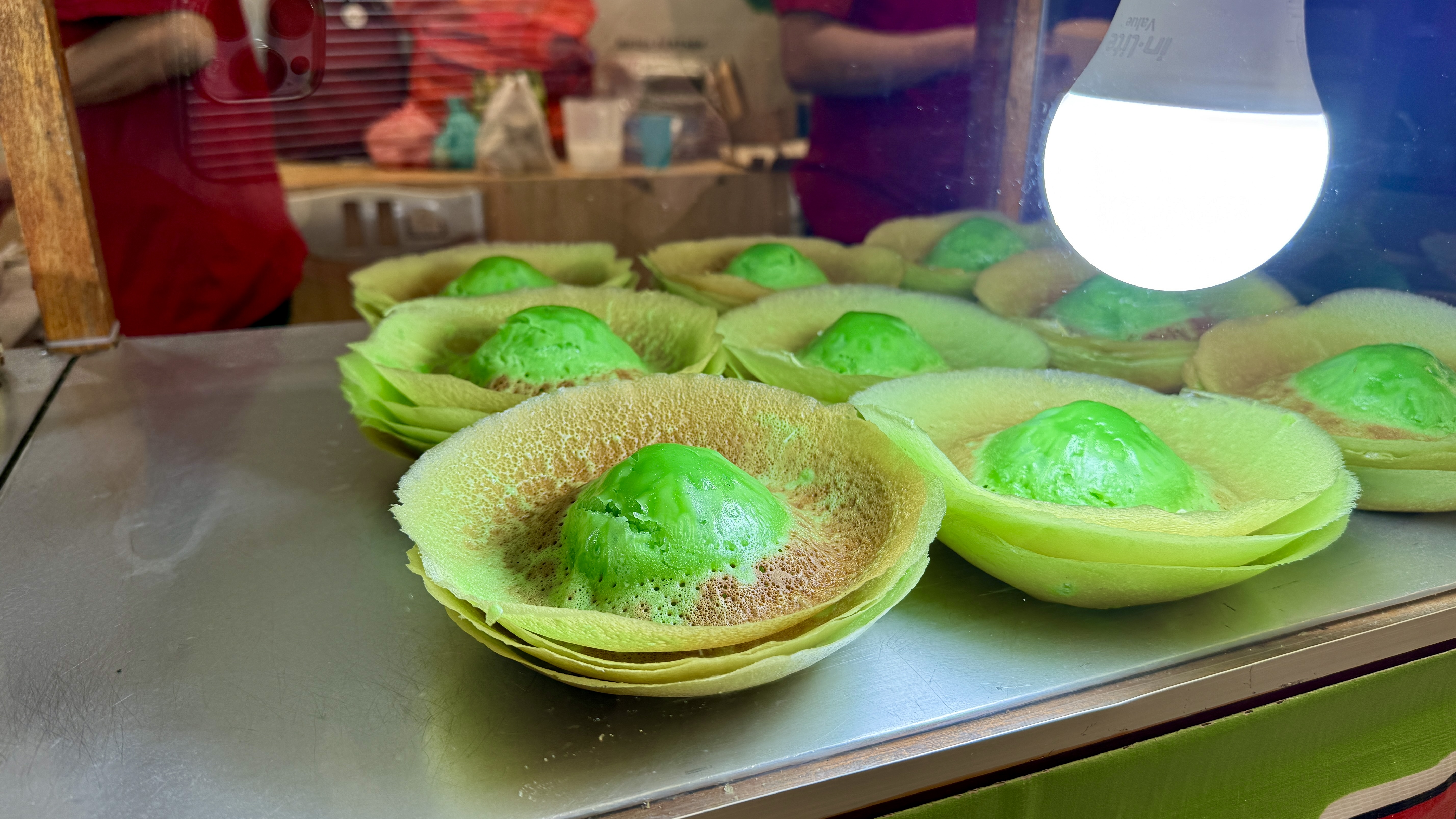 Женщина, которая их жарит, неплохо говорит по-английски и предлагает выбрать начинку — шоколад, сыр или джекфрут.