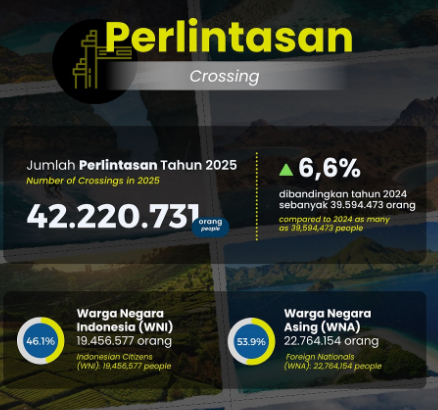 По данным миграционной службы, с января по середину октября границу Индонезии пересекли 42,22 миллиона человек, что на 6,6% больше, чем за тот же период прошлого года. Из них почти половина — граждане Индонезии, чуть больше половины — иностранцы. Более 20 миллионов человек воспользовались автогейтами.