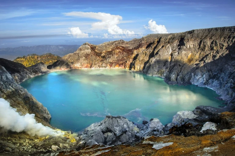 На вулкане Иджен вы увидите бирюзовое озеро в кратере, клубы серных испарений и редкое природное явление — синие огни, которые видны только в темноте. Здесь же работают местные шахтёры, добывающие серу вручную и поднимающие тяжёлые корзины из кратера — традиция, которая сохраняется столетиями.