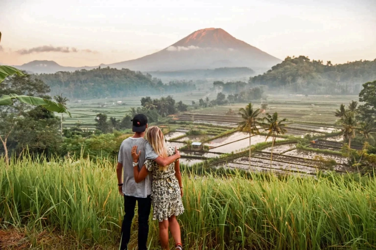 Кроме снорклинга, в программе — прогулка к двум водопадам, спрятанным в джунглях, и остановка в красивой точке с видом на вулкан Агунг на закате. Это один из тех пейзажей, ради которых стоит ехать на восток острова.