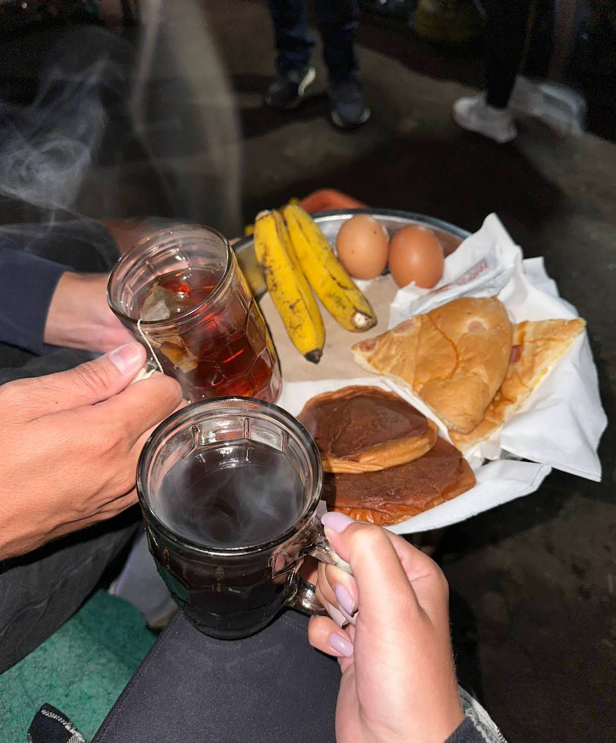 На вершине, перед самым рассветом, у вас будет время отдохнуть, перекусить (часто при турах включён лёгкий завтрак, например, бананы, бутерброды, сладости, варёные яйца, кофе или чай). Стоит отметить, что все продукты местные и недорогие, поэтому если у вас есть свои предпочтения в еде, лучше взять снеки с собой или же позавтракать потом в одном из красивых кафе района Кинтамани и насладиться волшебной атмосферой.