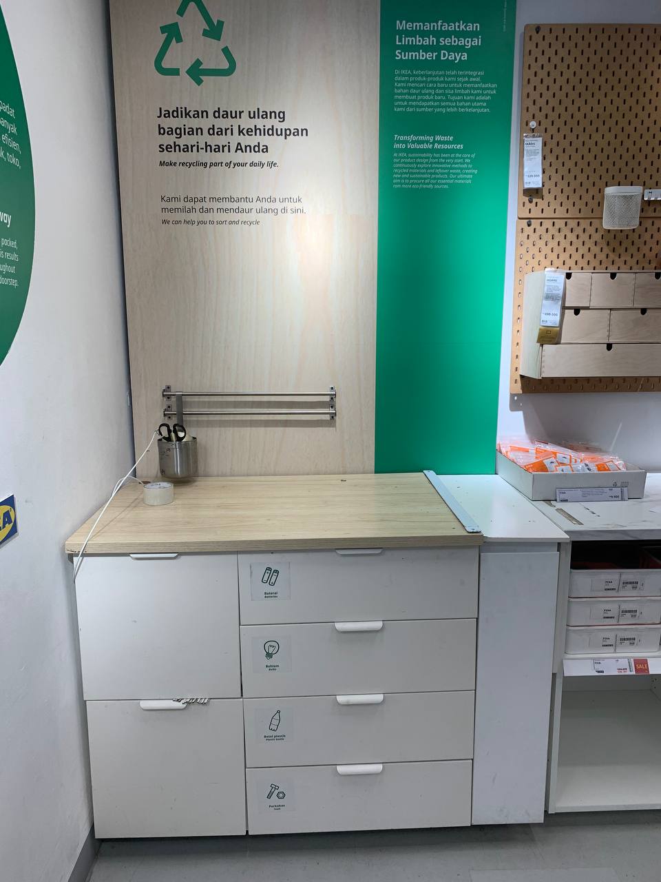 В Икее можно сдать батарейки, лампочки, пластик. Ящики расположены в углу за кассами, в зоне упаковки товаров